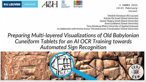 Hendrik Hameeuw and Gustav Rydberg Smidt participated in the First Meeting Of The Digital Ancient Near Eastern Studies Network, held 19 – 21 February 2023 in Israël with as theme, “Computational Perspectives on Ancient Near Eastern Literature, Art and Material Culture”. prof. Hendrik Hameeuw presented the following: “Preparing Multi-layered visualizations of old Babylonian cuneiform tablets for an AI OCR training towards automated sign recognition”. See learn more to watch the presentation and the abstracts.